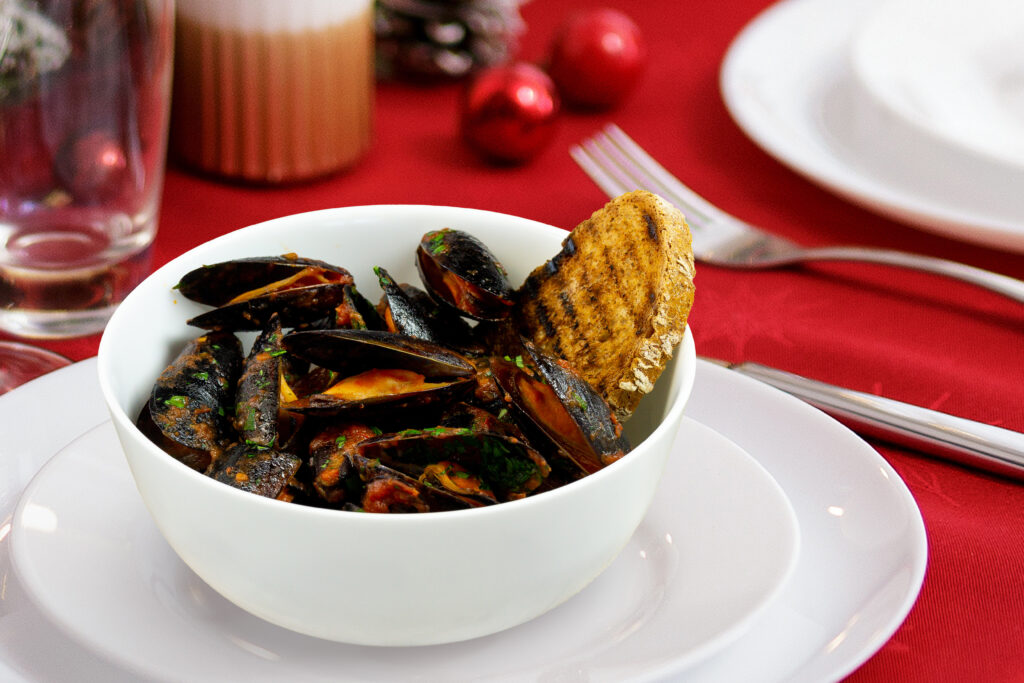 Il percorso sensoriale del Menù delle Feste si apre con le Cozze Cilene Panapesca, caratterizzate da carne morbida, sapore intenso e un guscio che racchiude tutta la ricchezza dell’oceano. Le cozze alla marinara sono un piatto simbolo della cucina mediterranea: pochi ingredienti – aglio, olio, vino bianco e prezzemolo – per un antipasto che conquista tutti al primo assaggio.